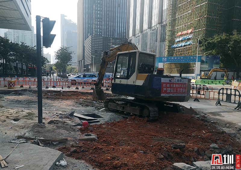 福田区福中三路和民田路的施工现场,道路被挖,一辆挖掘机停在道路上。
