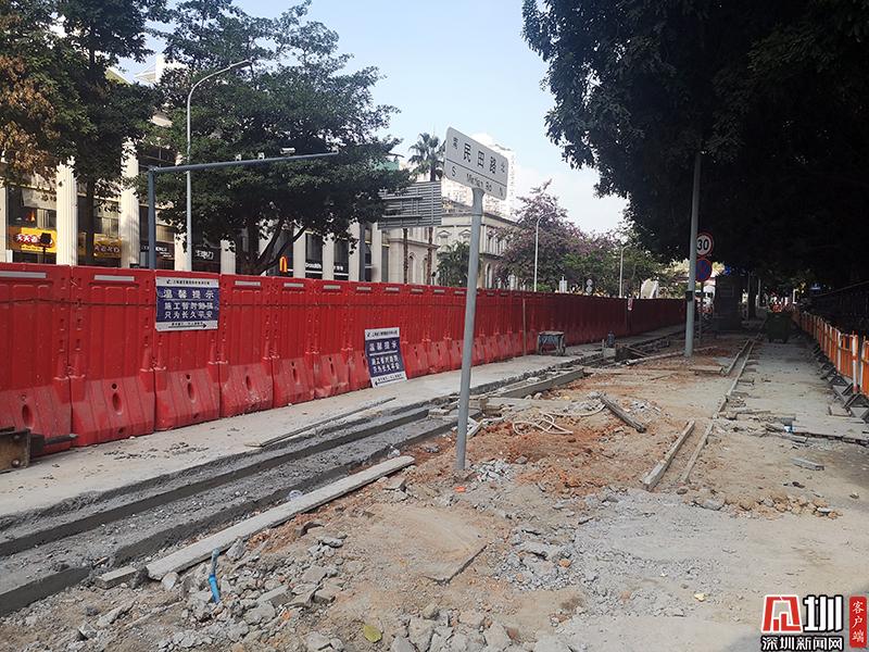 在福中三路和民田路交叉口的施工现场,民田路一侧的人行道几乎被全部“扒开”。