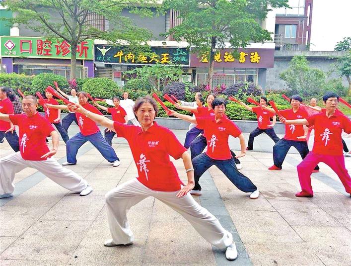 社会体育指导员雷仕林(前排中间)在鹭湖社区指导太极拳爱好者正确练习太极拳套路。