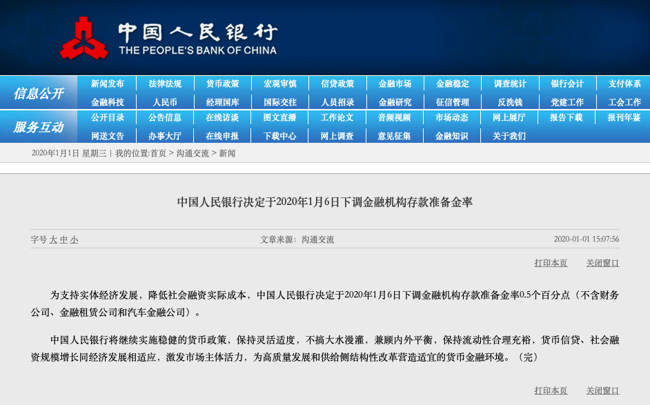 央行下调金融机构存款准备金率 来源:中国人民银行官网