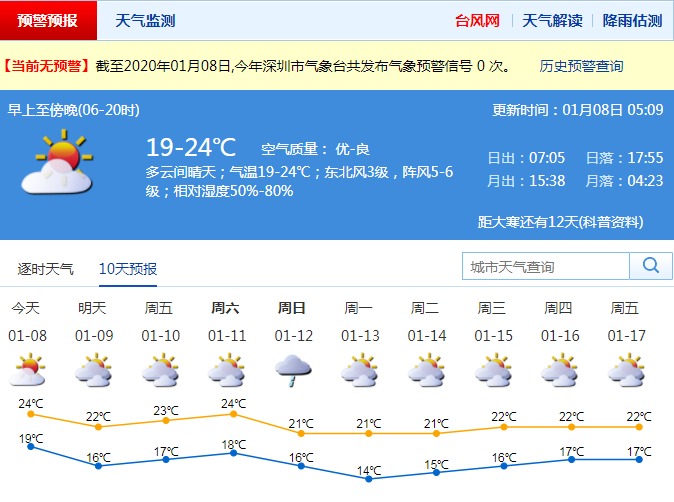 见圳客户端·深圳新闻网2020年1月8日讯 距离大寒12天 深圳今日最高温24℃,多云间晴天;气温19-24℃;东北风3级,阵风5-6级;相对湿度50%-80%。