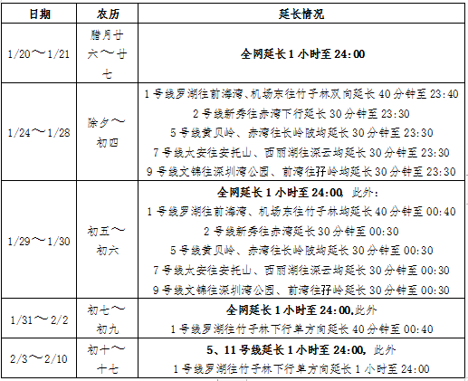 2020年春运期间深圳地铁延长情况表: