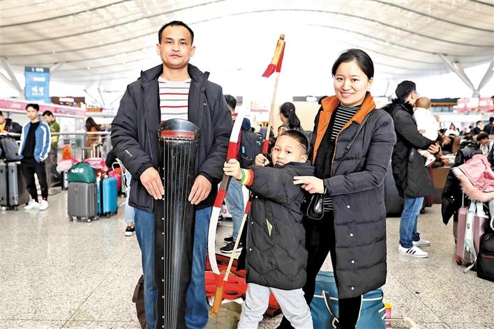 刘永青(左)带着自制的古琴与家人踏上回家路。