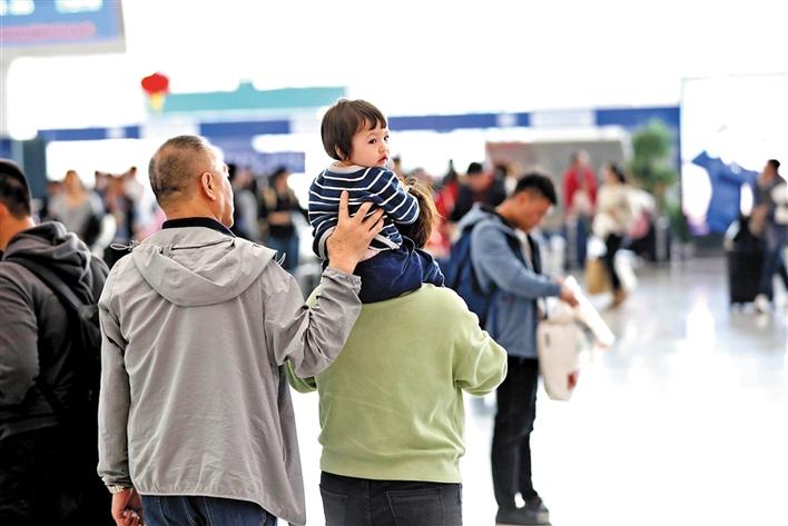 深圳北站候车大厅内,一名小女孩坐在家长肩膀上四处张望。