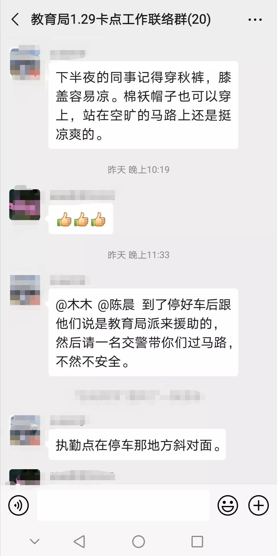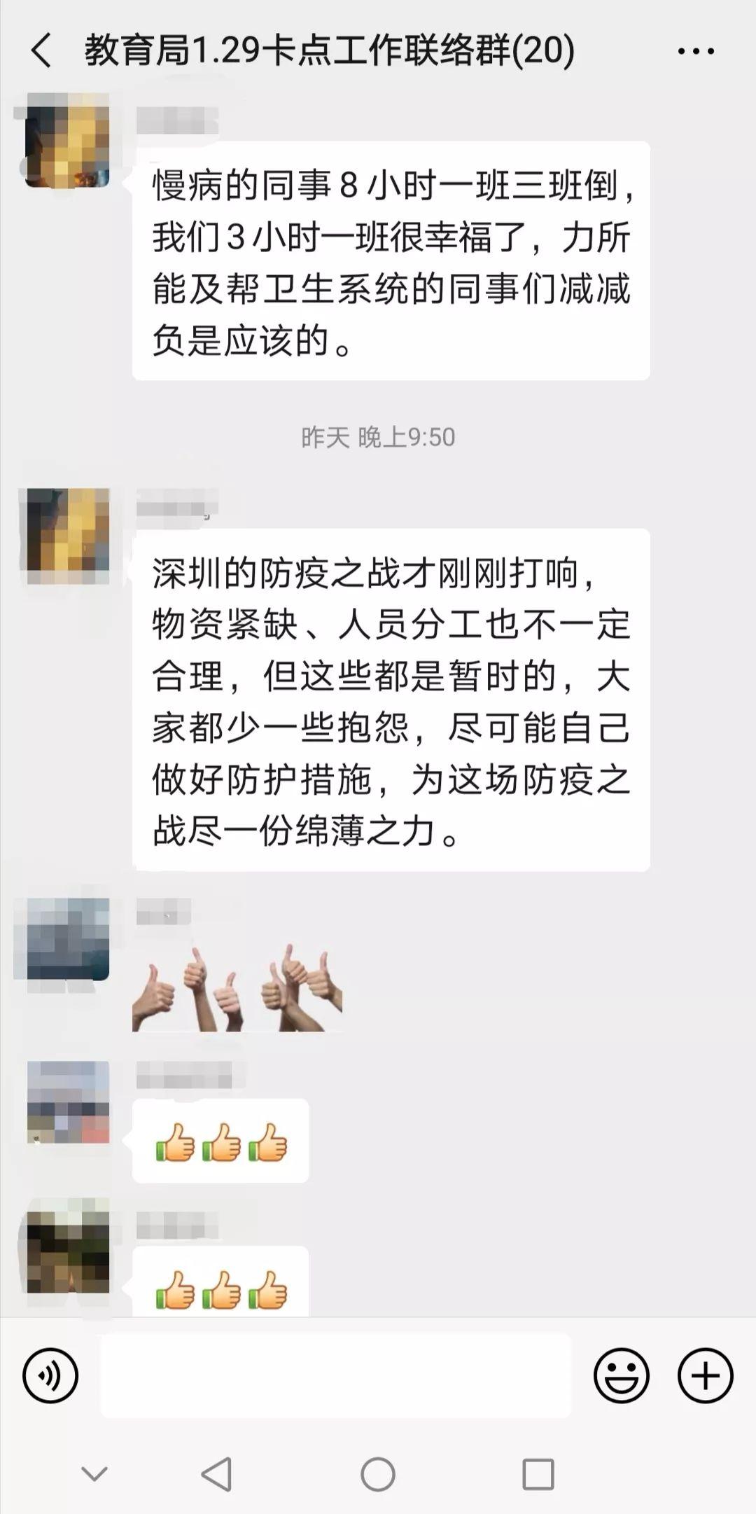 在临时组成的“教育局1.29卡点工作联络群”中,他们相互打气:“慢病(龙华区慢性病防治中心)的同事8小时一班三班倒,我们3小时一班很幸福了,力所能及帮卫生系统的同事们减减负是应该的。”“深圳的防疫之战才刚刚打响……自己尽可能做好防护措施,为这场防疫之战尽一份力。”他们也积极分享工作心得,温馨提示着接班的同志们。