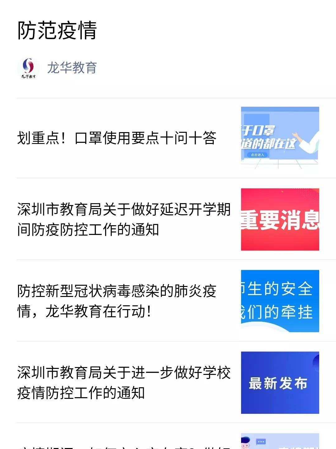 3.为了方便大家查看近期抗击肺炎疫情相关推文,“龙华教育”公众号整合了相关内容,请大家查看“龙华教育-教育发布-防范疫情”。