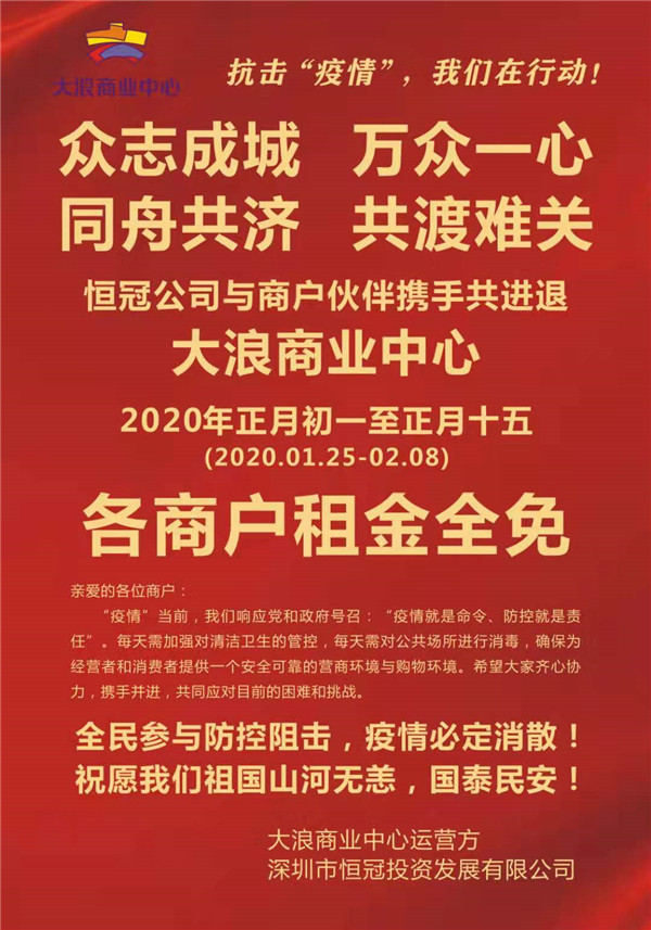 大浪街道还向辖区工业园区、写字楼业主、物业管理方及经营者发起倡议,为延迟复工的企业和租户减免租金、减免物业管理和其他费用,减轻企业、商户负担。该倡议得到了辖区工业园区的积极回应。辖区德泰工业园、科惠工业园分别为园区企业减免一个月、半个月租金;大浪商业中心也发出公告,宣布免除商业中心各商户正月初一至正月十五的租金。目前,三个园区累计减租金额达1220万。
