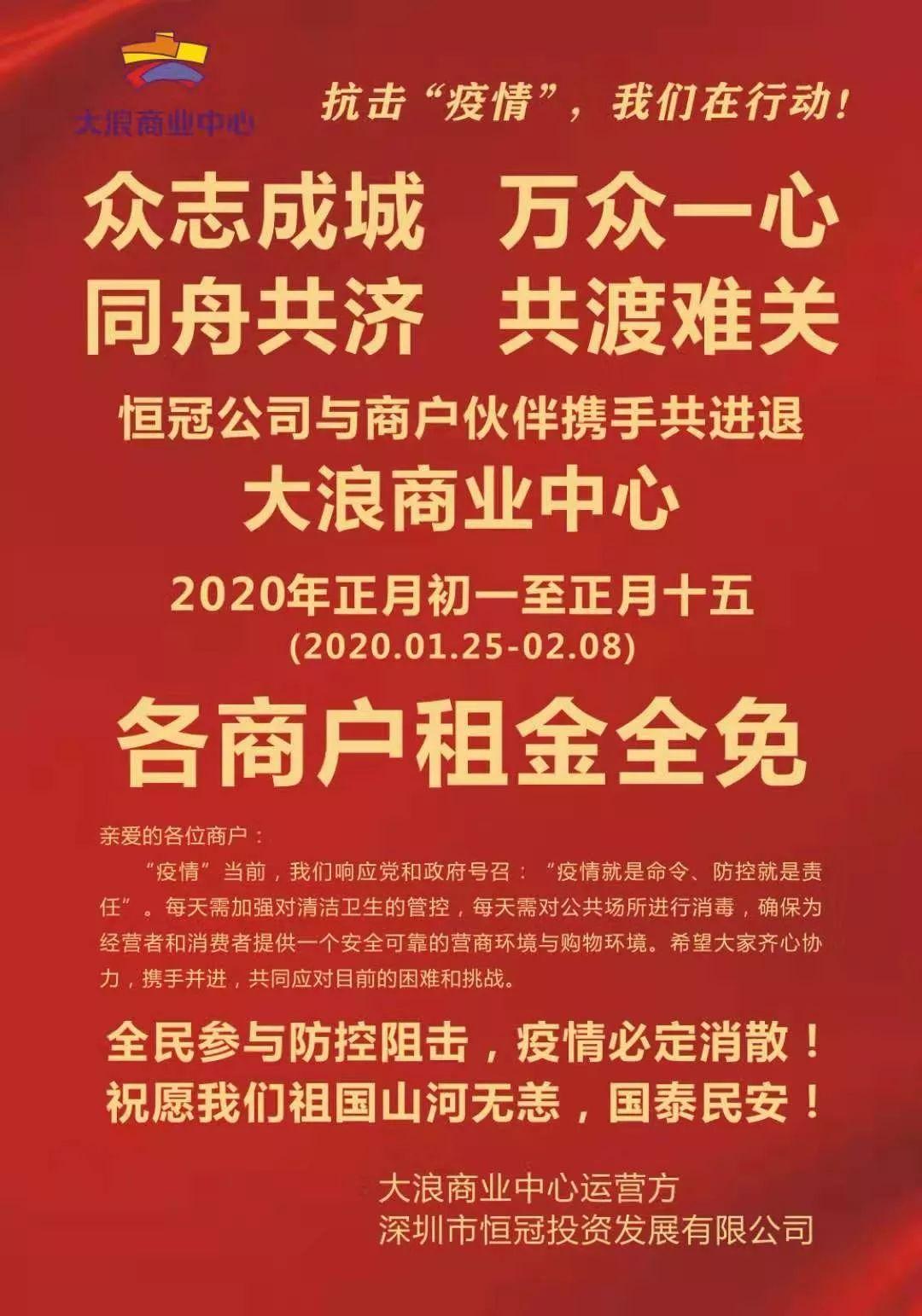 大浪商业中心也发出公告,宣布免除商业中心各商户正月初一至正月十五的租金。