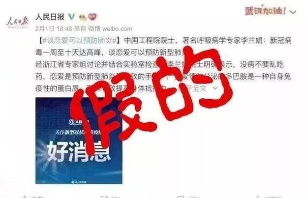 有人造谣:“李兰娟院士说谈恋爱可以预防新型冠状病毒感染的肺炎”,后被澄清系网友P图恶搞。