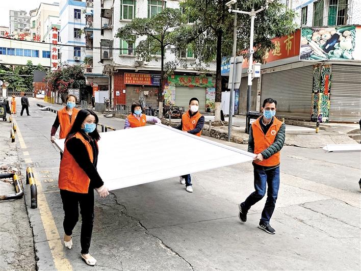 大浪同胜社区工作人员搬运挡板,对茶角坎新村进行围合。