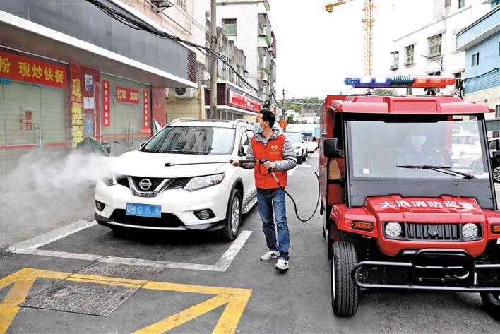 大浪上岭排社区工作人员对社区公共区域进行消杀。