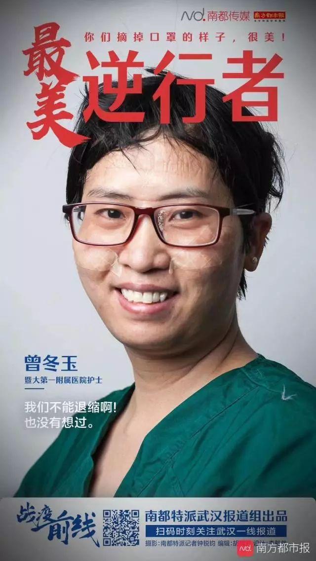 姓名:曾冬玉单位:暨大第一附属医院出生年:1982(沉默)我觉得太真实了,虽然第一眼觉得自己很丑,但细看我觉得自己挺美的。其实可以看出在上班的时候,除了承受工作压力外还有装备的压力。即使是额头被压出痕,脸上针扎一样难受,但是我们依然要坚持下去。因为我们不能退缩啊!也没有想过。每次穿好衣服准备开门进病区的时候我都会给自己鼓劲。但我开门进去以后,我就知道我要抛除一切杂念。脱下衣服的时候,有种如释重负的感觉:嗯,我又战胜了我自己!对父母,我是没有告诉过他们的,从来不敢和他们视频,因为怕他们发现我来了武汉。每次我妈要视频的时候我就说我很忙,有空我回你。其实我就是担心他们知道。前几天我爸不舒服,我急坏了,万一他有什么事我真不知道怎么办。我叮嘱他们出门一定要戴口罩,一定要洗手。只有他们平安我才能专心打仗。孩子爸爸也是医院的,他也比较理解,他会在家看着孩子学习。我们非常想念对方,孩子和我从来没有分开过那么久,每次视频他都哭。