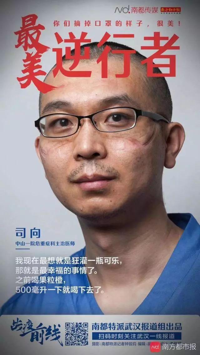 姓名:司向单位:中山大学第一附属医院职位:危重症学科主治医师觉得挺……怎么说?挺不可思议的。如果是平常绝对不会压成这样的。防护服让效率比平时降低了好多,各种不舒服,闷热,眼镜上一层全是汗水,行动也不便,很难受。现在已经好太多了。第一次进去的时候我戴的是另一种口罩(下面有个缝合位),往下滑,正好碰到喉结,一直摩擦了六个小时,整个喉结的表面磨出了一个印子。第二次就是耳朵,六个小时后都已经结痂了。第三次……完全眼睛啥都看不见。每次都不舒服,慢慢熟练后就会想怎么避开。我今天上班前,我心想“我不想上班……”,因为我们来二十多天了,现在大家生物钟都紊乱了。我现在最想就是狂灌一瓶可乐,那就是最幸福的事情了。之前喝果粒橙,500毫升一下就喝下去了。首先祝我媳妇儿情人节快乐!第二,希望我闺女不要受疫情的影响,在广州应该没事的,希望她平安就可以了。大年三十的时候我和父母简单吃了一顿,因为我们晚上九点就要在医院集合了。我先在岳父岳母家坐了一阵,然后回我爸妈家坐了一下子,不到半小时就结束了。我妈很担心,觉得很危险。我爹嘛,中国的父子肯定很多话是不说的,他就说了句“注意安全”。我估计,他想说的很多,最后汇成一句话就是这句了。