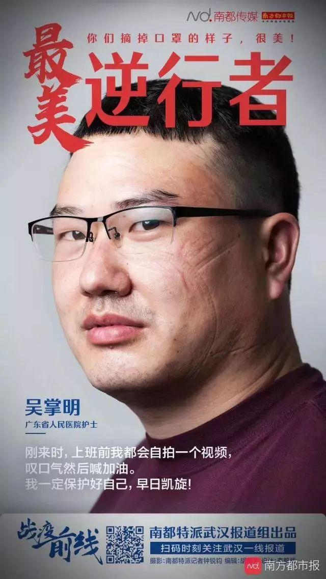 姓名:吴掌明单位:广东省人民医院出生年:1988照片里这是个大爷!连大叔都不是了!关于防护服,我觉得现在还好啦,刚开始感觉呼吸不顺畅,不知道四小时怎么熬。习惯了以后心态也好了,不再想什么时候才熬到下班。刚来的时候,上班前我都会自拍一个视频,叹口气然后喊加油。我的朋友问这是什么意思,我说心情复杂不知道怎么讲。刚刚我在楼顶看我们科室每个人给我写的一句话,看哭了。你们放心,一定保护好自己,早日凯旋!