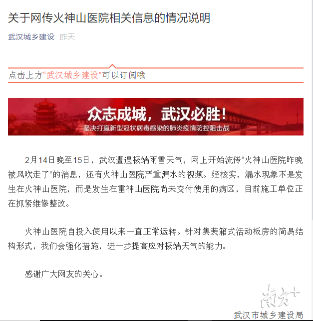 2月14日晚至15日,武汉遭遇极端雨雪天气,网上开始流传“火神山医院昨晚被风吹走了”的消息,还附上了火神山医院严重漏水的视频。