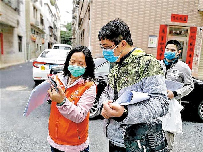 牛湖社区党员志愿者在社区登记居民相关信息。