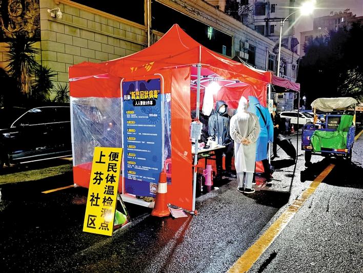 夜深了,上芬社区便民体温检测点的灯依然亮着。