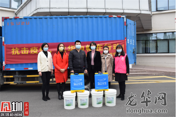 ▲抗击疫情,巾帼在行动。2月10日,龙华区女企业家协会向福城街道捐赠20桶84消毒液。