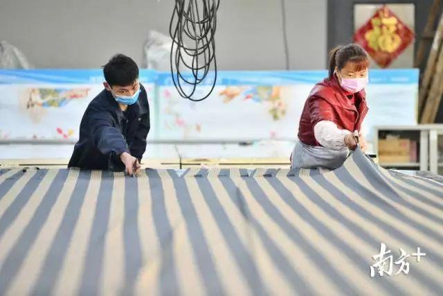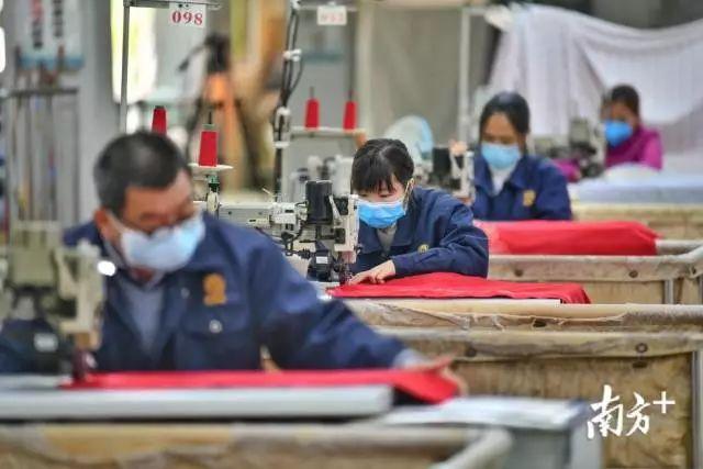 佛山西樵黛富妮家纺复工复产,缝制车间内员工戴着口罩进行生产。戴嘉信 摄
