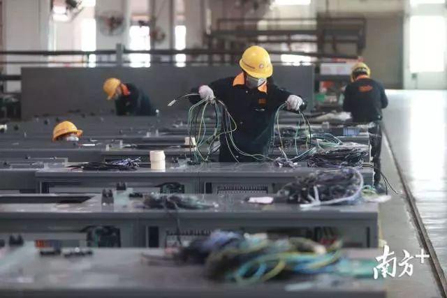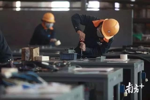 2月17日,在深圳坪山区震雄工业园的生产车间,工人们佩戴口罩工作。目前,该园已有300多名员工陆续到岗。南方日报记者 朱洪波 摄