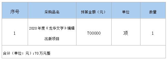 根据《深圳经济特区政府采购条例》、《深圳经济特区政府采购条例实施细则》和《深圳网上政府采购管理暂行办法》、《中共深圳市龙华区委宣传部自行采购管理暂行规定》的有关规定,深圳市龙华区文学艺术界联合会就2020年度《龙华文学》编辑出版项目,采用网上公开选取供应商提供服务式实施采购,欢迎符合资格的供应商参加。
