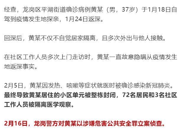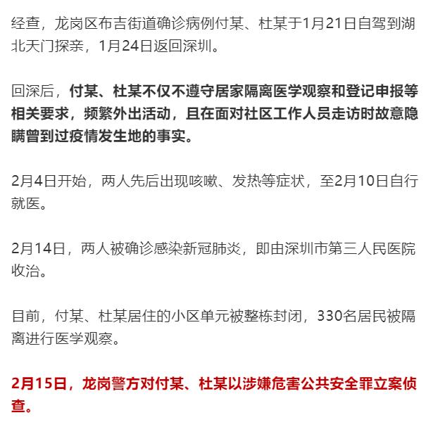 隔离期间连续多日外出确诊前后多次隐瞒行程……此前深圳已有多人被立案侦查不单深圳全国也发生过多起类似隐瞒造成严重后果的案情近日,深圳龙岗警方相继对故意隐瞒从疫情发生地返深事实、不配合疫情防控申报登记、不遵守居家隔离医学观察的感染新冠肺炎确诊病例付某(男,58岁)、杜某(女,55岁,付某妻子)、黄某(男,37岁)3人以涉嫌危害公共安全罪立案侦查。▲布吉街道一对夫妻故意隐瞒从疫情发生地返深事实,导致小区单元整栋封闭,330居民被隔离观察。深网评 疫情发生以来,全国出现多起隐瞒病情或者接触史的案例,这已经出离了道德问题