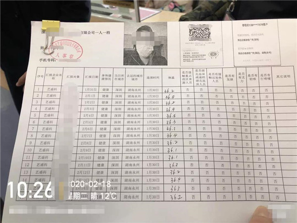 通过完善的一人一档,管理人员对员工近期生活轨迹、健康状况一目了然(表格含个人信息、照片、i深圳申报情况、消费记录等作证信息)。