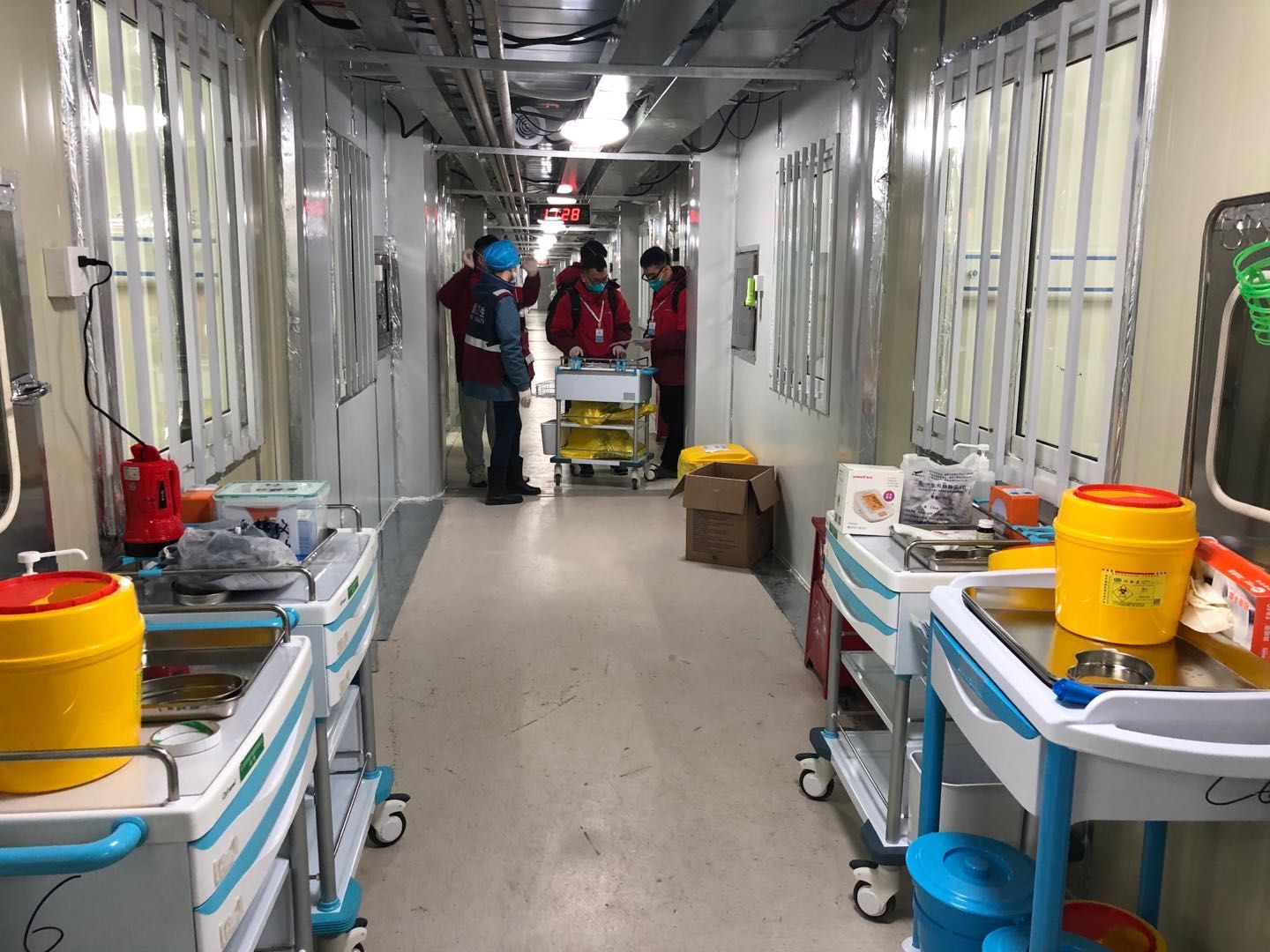 医院还设置了一间手术室,心电诊断科、超声影像科、放射影像科及医学检验科等医技科室,能够满足新冠肺炎患者的辅助诊断要求。医院配备CT、床边超声、全自动生化分析仪、艾克膜、床边血气分析仪、有创无创呼吸机等必需的设施设备,并实现CT和心电的远程诊断传输。