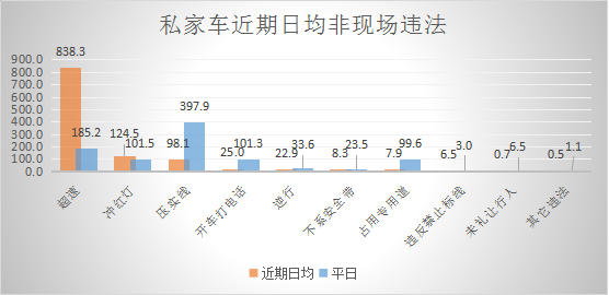通过对全市非现场违法行为进行分析,日均非现场违法1468宗,私家车占77.15%,较平日增加了25.21%。而私家车的非现场违法中,超速及冲红灯较平日增加,特别是超速违法日均有838.3宗,是平日的4.5倍。