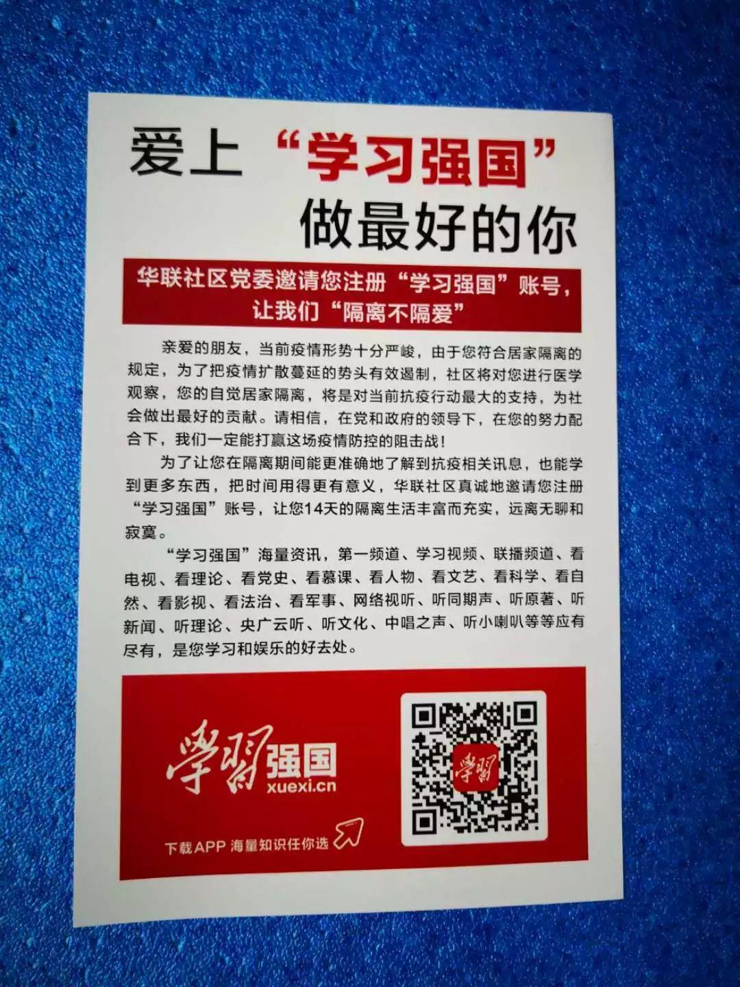 邀请隔离居民注册“学习强国”,使隔离的居民在隔离期间不仅能及时了解新闻资讯、疫情防控政策,还能学习知识、丰富生活。