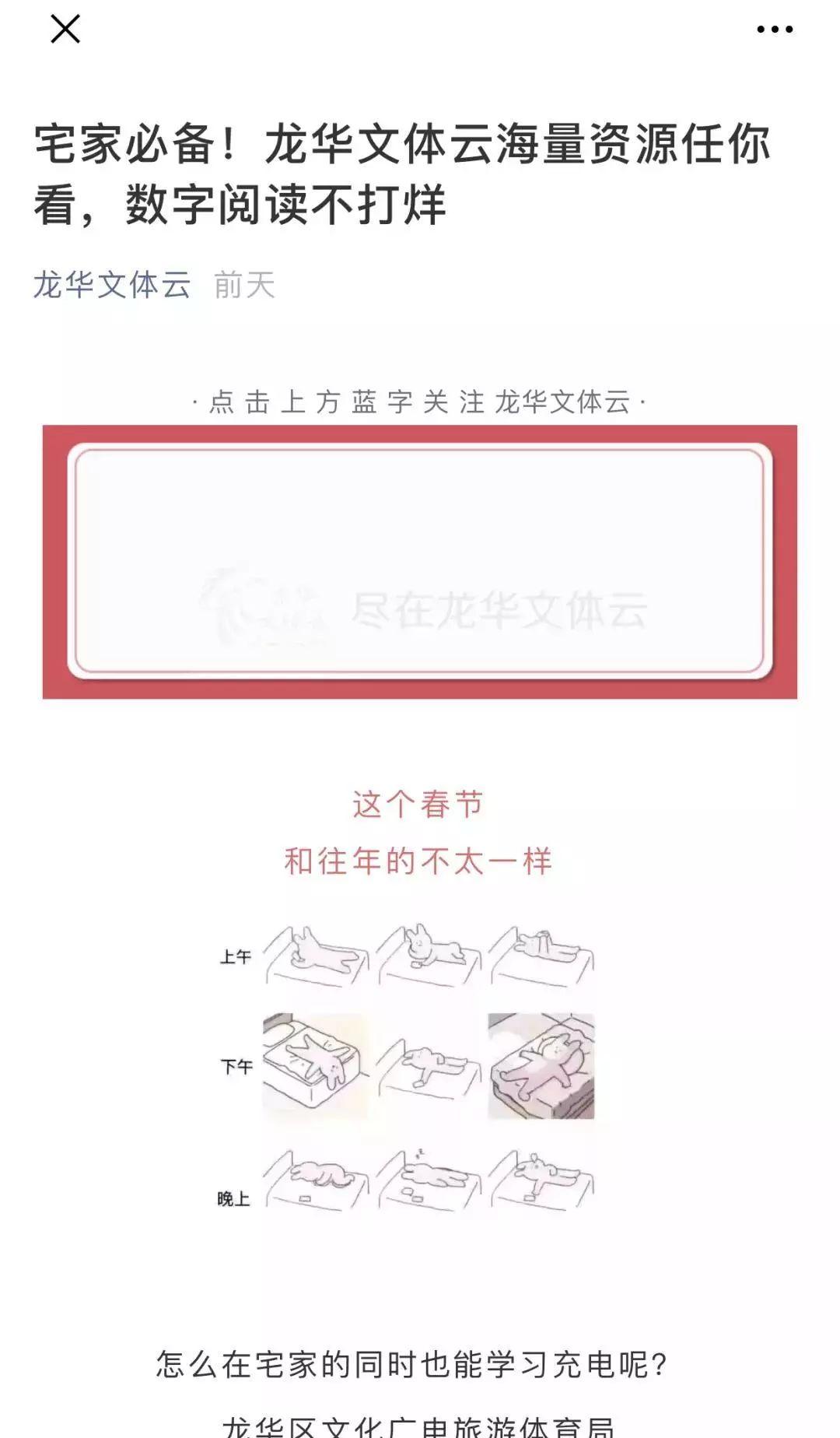 为缓解居家隔离人员情绪,丰富其精神文化活动,龙华街道还引导居民使用“龙华文体云”提供的免费数字资源库进行线上学习,利用“宅家”时间“充电”,满足居家阅读需求,丰富精神世界,帮助居民充实快乐宅在家。