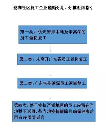 鹭湖社区编制《鹭湖社区复工企业遵循分期、分批返岗指引》,要求企业在确保安全的情况下,分地区、分期分批有序组织员工返岗。