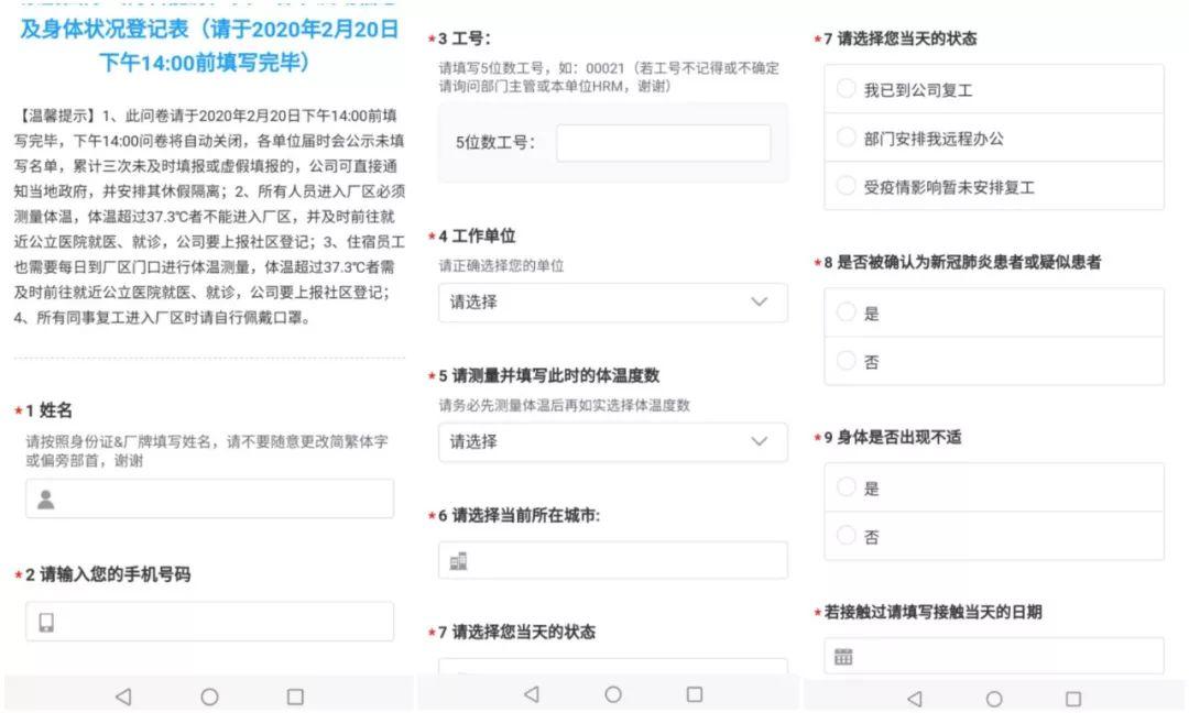 企业要求每位员工在上班期间要佩戴口罩,并通过问卷调查了解员工的体温及身体状况,身体不适或者体温超标的员工暂缓上班。