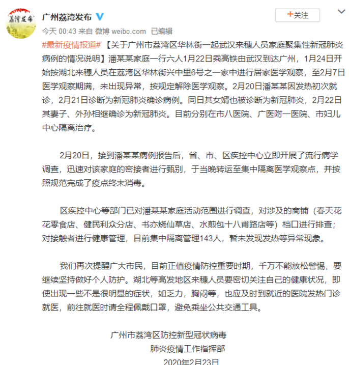 见圳客户端.深圳新闻网2020年2月24日讯 据广州荔湾发布消息,潘某某家庭一行六人1月22日乘高铁由武汉到达广州,1月24日开始按湖北来穗人员在荔湾区华林街兴中里6号之一家中进行居家医学观察,至2月7日医学观察期满,未出现异常,按规定解除医学观察。2月20日潘某某因发热初次就诊,2月21日诊断为新冠肺炎确诊病例。同日其女婿也被诊断为新冠肺炎,2月22日其妻子、外孙相继确诊为新冠肺炎。目前分别在市八医院、广医附一医院、市妇儿中心隔离治疗。