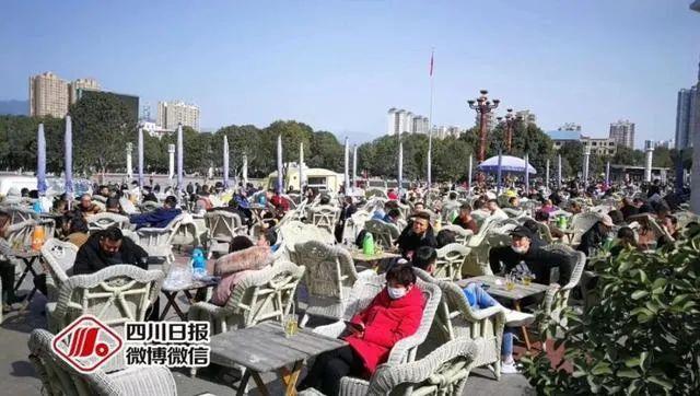 △2月21日,四川广元市利州广场,市民扎堆喝坝坝茶。