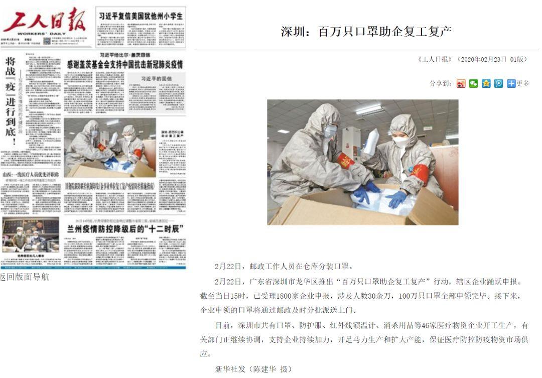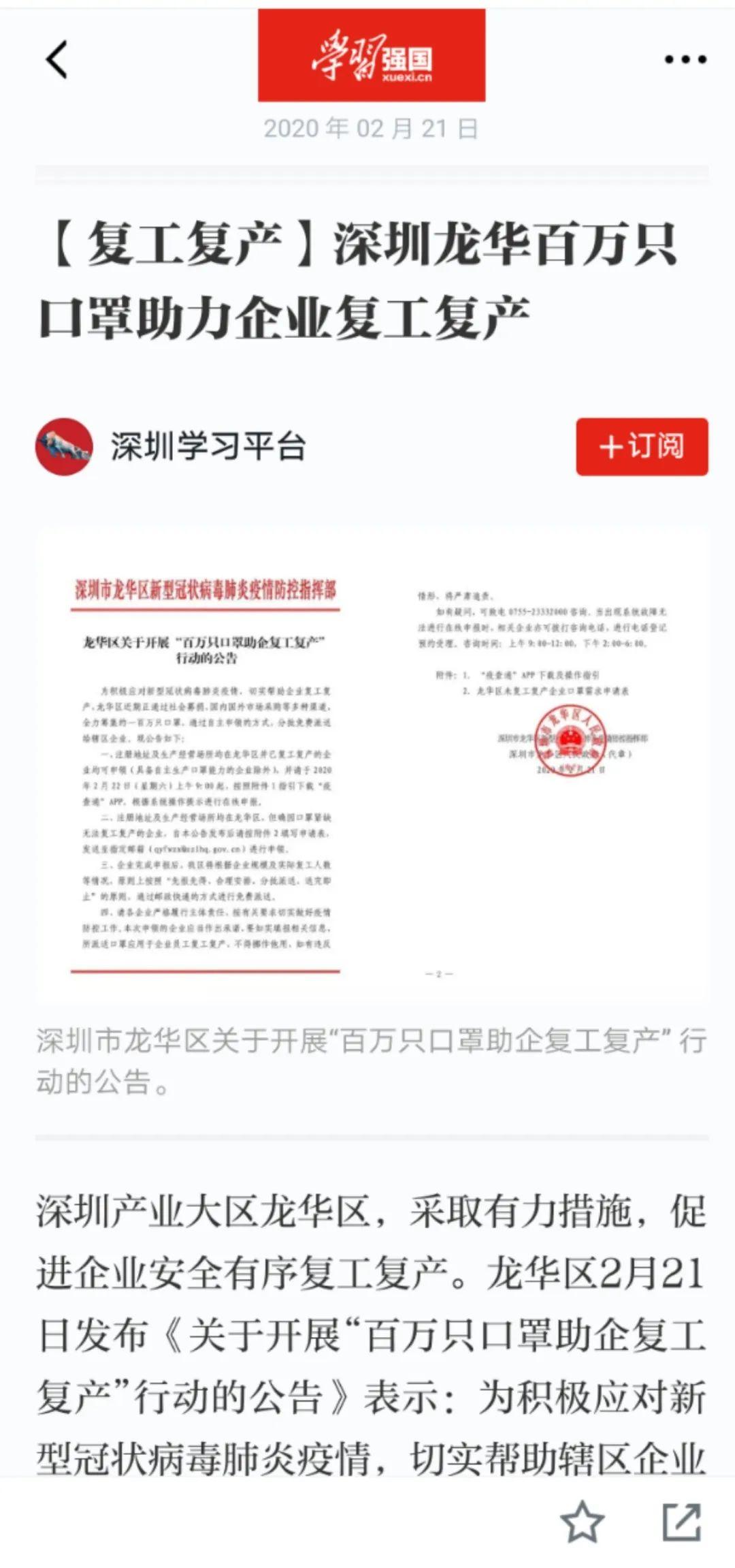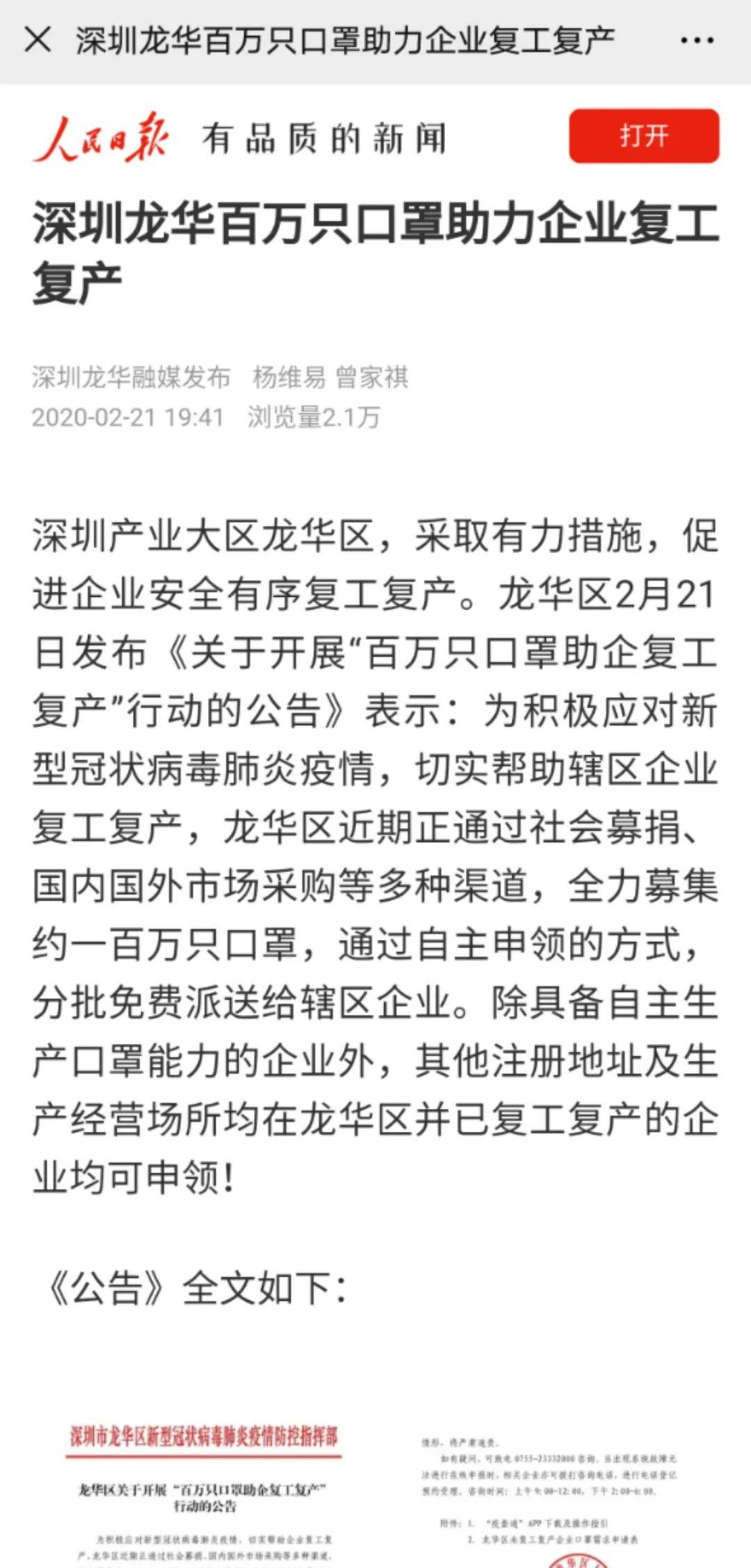 龙华区此次行动覆盖面广,除辖区内有能力生产口罩的企业外,注册地址及生产经营场所均在龙华区并已复工复产的企业,或准备复工但口罩紧缺的企业均可免费申领口罩。