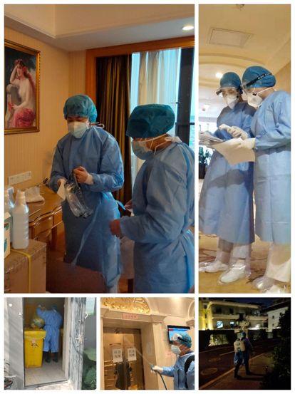 2月7日上午11时30分,火神山医院援建志愿者顺利抵达定点隔离的酒店,疾控组迅速给每一位援建者的身表、行李、汽车进行细致消毒,医疗组为援建者测量体温,询问、检查身体健康情况,各项保障和服务有条不紊地进行。