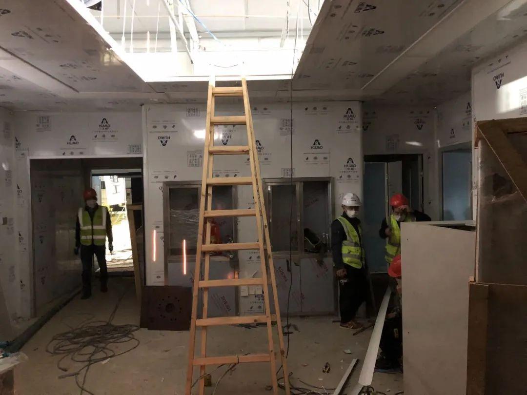 据悉,这支由20人组成的援建志愿者团队主要负责医院ICU病房的彩钢板结构和电气安装工作。“ICU洁净病房对气密性要求极高,气体要经过初、中、高三级净化后才可以送进病房,而病房里受污染的空气需要集中收治并进行杀菌处理后才能排放到大气中去。”马仁勤说道,“当时到达现场后发现地板都没开始铺设,地面也是湿的,还不具备团队的施工条件。于是我们就根据现场实际情况,开始商讨材料设备的放置和调取问题。”