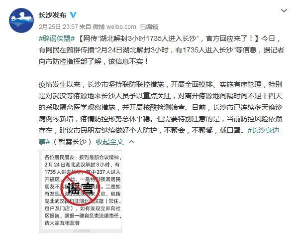 据长沙市委网信办官方微博“长沙发布”消息,25日有网民在圈群传播“2月24日湖北解封3小时,有1735人进入长沙”等信息,据记者向市防控指挥部了解,该信息不实!