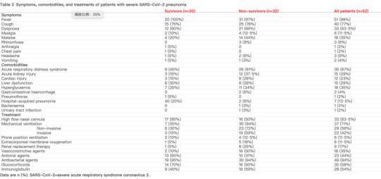 多数患者出现器官功能受损,其中急性呼吸窘迫综合征35例(67%),急性肾损伤15例(29%),心脏损伤12例(23%),肝功能不全15例(29%)和气胸1例(2%)。医院获得性感染在7名(13.5%)患者中出现。
