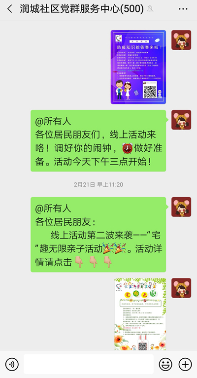 据了解,润城社区党群服务中心线上活动共分为三大部分:一是“防疫知识抢答赛”;二是“宅”趣无限亲子活动;三是“线上加油站”,社区居民通过录制视频、画画、唱歌等方式,为此次战“疫”负重前行的各行各业最美“逆行者”加油。目前共开展活动6场,居民们参与热情高涨,积极转发活动海报,你拉我我拉他,相继进群。活动中,社工利用语音和文字讲解活动规则,回答居民疑惑。居民们也纷纷晒出自己的图片、视频记录生活中的温馨瞬间,并通过各种方式为一线防疫工作人员加油。而围绕新冠肺炎是什么、防护用品的使用以及如何更好做好自我防护展开的防疫抢答赛尤其受居民欢迎,为了不错过防疫知识抢答赛,居民们在微信群里互相提醒要定闹钟不要忘记参与抢答。参加活动的社区居民也纷纷表示:“喜欢这种形式,既涨知识又很欢乐。”