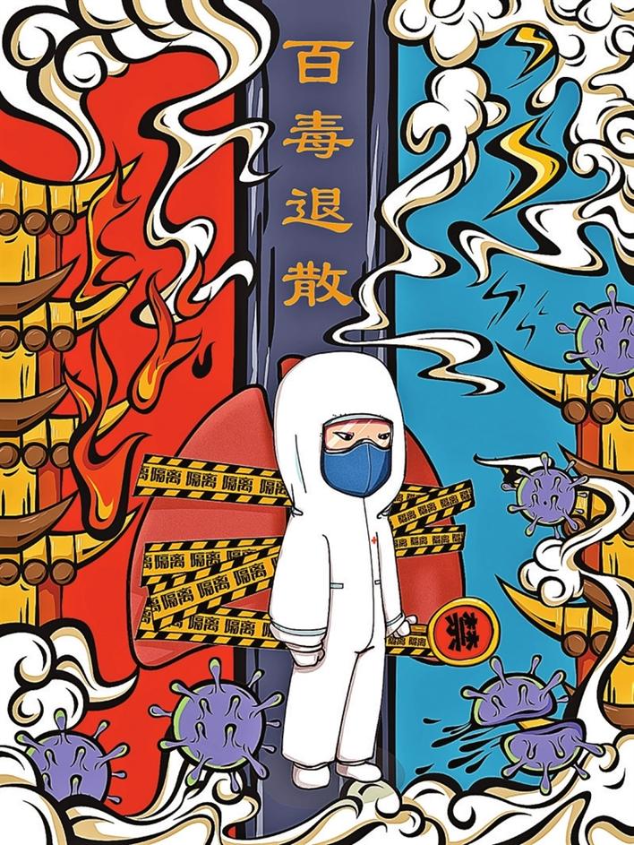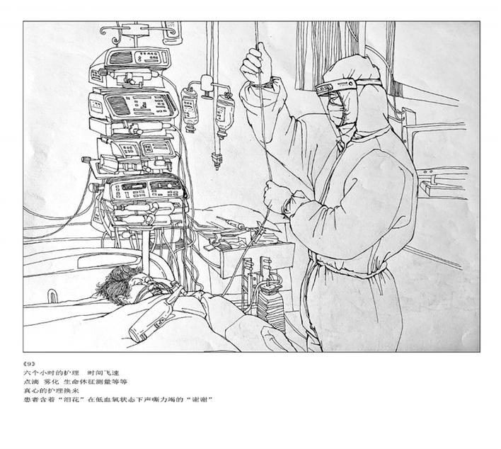 龙华区版画家协会理事孙艳碧擅长版画创作,这次她以系列连环画的形式创作了十一幅作品和一个封页,取名《奉献》。“我创作的人物是医护人员,他们不顾个人安危,始终坚守在危险的一线,让人感动。”孙艳碧表示,最初她只是创作了两个医护人员的形象,不过随着疫情的发展,越来越多医护人员出现在新闻镜头中,“我感觉两幅作品已不足以表达我的崇敬之情,于是便构思了一套连环画,以系列画作配诗的艺术表现形式完成了创作。”