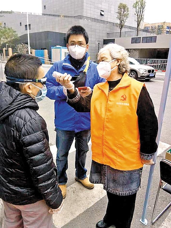 测温、询问、核查通行证,动作一气呵成,在龙悦居的卡点上,满头银发的老党员王巧云做起这些工作丝毫也不输年轻人。70岁的她是一名志愿者,疫情发生后,看到卡点人手不足,她主动报名参与抗疫工作,虽然片区负责人及党员们一再相劝,年纪大了不要去,但王巧云仍不愿退缩。