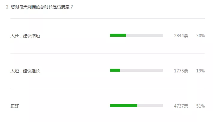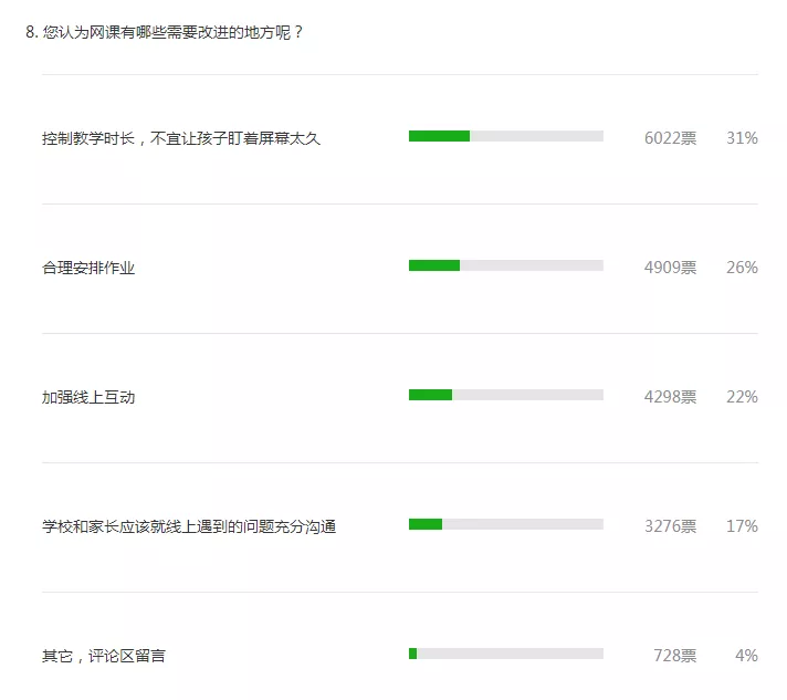 转眼间, 同学们在家上网课一段时间了, 隔着屏幕学习 这届老师、学生、家长能hold住吗? 他们都有什么意见和建议? 昨天,深圳新闻网发布了 关于网课开展情况的调查, 近万名网友参与了本次投票。 让我们一起来看看大家的意见和建议吧! 图自:晶报 01 网课时长较受认可 对于网课的时长,大部分参与者持积极态度。超过半数的网友认为每节网课的时长和每天网课的总时长比较科学。 02 家长:难以时刻监管 网课的效果到底如何?根据深圳新闻网的调查,64%的参与者对网课效果感到“满意”或“一般”。多数参与者认为“孩子容易走神”或“需要家长时刻监管”。在低年级孩子“难以集中注意力”这一问题在留言里尤为突显。 虽然网课两端是老师和学生,但家长的参与也必不可少。部分参与者认为,如果没有家长的有效监管,网课很难保证教学质量,而大部分家长已经复工,无法时刻盯着孩子。有些家长晚上下班后还要监督孩子上网课、做作业,实在“费时、费力、费神”。让孩子自己上网课,有些“连作业是什么都不清楚”。还有些孩子利用上网课的空档玩游戏,甚至“从十七号开始到现在玩游戏超过1万块”。 部分家长——特别是老人对网课软件不熟悉、不会操作,也是造成家长监管难的重要原因之一。 有些参与者则直接留言:由于孩子自律性差,建议低年级不上网课。 宝安区官田学校历史老师刘红玉在家录制网课。宝安日报记者宋璐摄 03 作业成为部分家长的负担 根据投票结果,68%的人认为网课后的作业在60分钟内可以完成。不过,许多参与者认为网课后的作业对于家长来说负担较重。 22%的参与者认为,应该更加合理地安排作业。有家长提到,交作业太过麻烦:从做作业到交作业的整个流程比上课时间还长;也有家长提及,每天下班后盯着孩子做作业“心很累”。 有位一年级孩子的家长坦言,由于需要全程陪读才知道作业是什么,下班后的自己也有所松懈,感觉对不起老师的辛勤付出。 陈美华老师为了直播特意买了新电脑 04 家长、老师:网课缺乏教学氛围 是否拥有相应的电子设备和良好的网络是保障网课顺利进行的基础。调查结果显示,超过98%的参与者使用手机、平板或电脑进行网课。也有8%的调查者曾遇到没有设备的问题。 仅有6%的参与者在网课中从未遇到障碍。39%的参与者曾遇到网络卡顿、延迟的问题,20%的参与者曾遇到网课没声音、没网络等问题。 有家长表示,如果遇上网络卡顿,很容易跟不上老师讲课的节奏。还有家长表示曾出现过因为网络太卡,有时候设备刚弄好,课程就已经结束了的情况。 此外,22%的参与者认为,网课缺乏教学氛围,无法真正实现互动式在线课堂。有家长认为,目前老师用群进行讲解,聊天消息过多,信息杂乱,老师无法及时答疑,建议老师通过小视频等形式将热点问题再进行补充讲解。 许多家长对孩子视力十分担忧。持该意见的家长认为,目前网课使孩子使用电子设备时间过长,对孩子视力造成不小影响。一位高二班主任老师也表示,不仅学生的视力受到影响,老师也要每天长时间面对着手机和电脑,眼睛的健康难以保证。