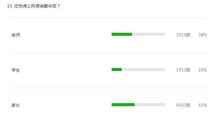 关于上网课谁最辛苦,有43%的参与者认为家长最辛苦,38%认为老师更辛苦。