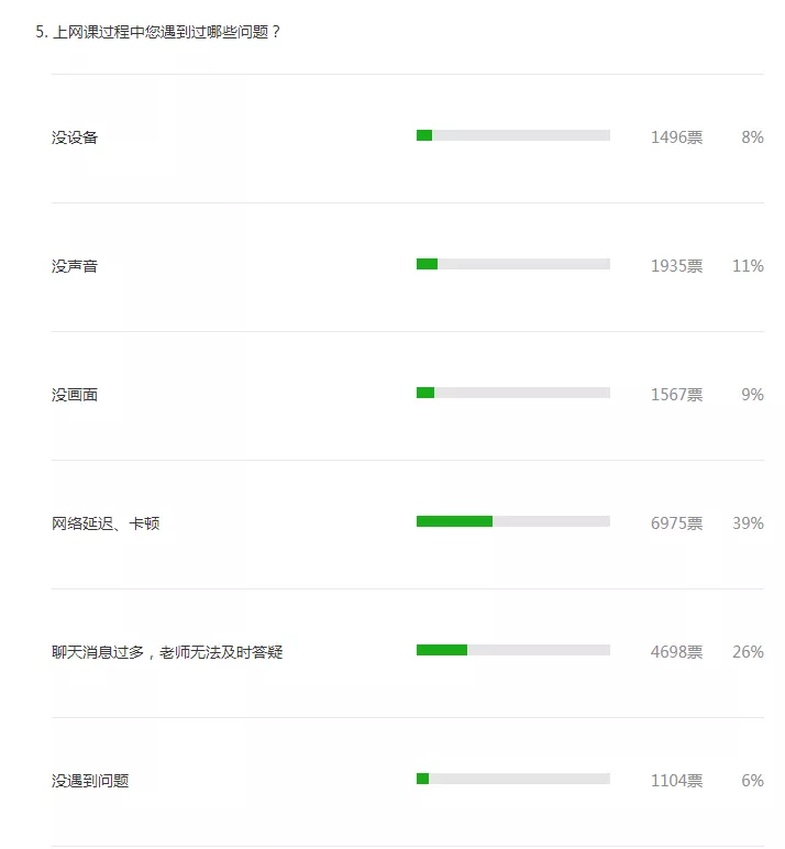 仅有6%的参与者在网课中从未遇到障碍。39%的参与者曾遇到网络卡顿、延迟的问题,20%的参与者曾遇到网课没声音、没网络等问题。