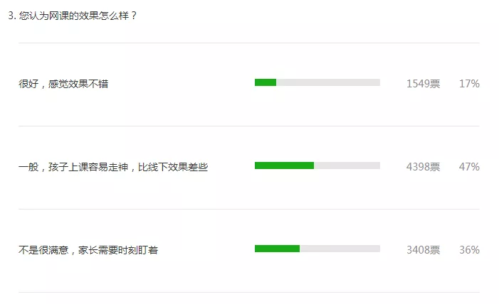 网课的效果到底如何?根据深圳新闻网的调查,64%的参与者对网课效果感到“满意”或“一般”。多数参与者认为“孩子容易走神”或“需要家长时刻监管”。在低年级孩子“难以集中注意力”这一问题在留言里尤为突显。