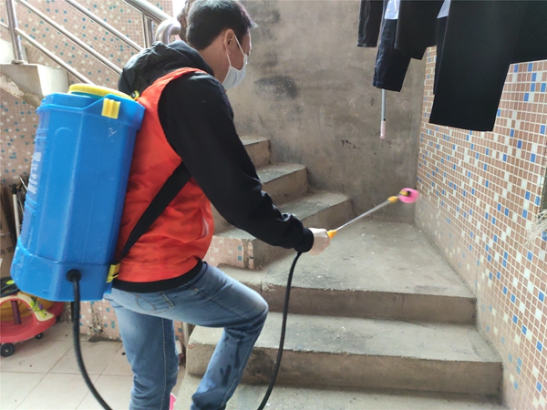 他重视小区消杀工作,每天亲自带队背着40斤重的消杀桶,在竹村东西区大街小巷、各个角落开展消毒工作,尤其对人员来往频繁地区进行重点消杀,有时遇到村民有需求,还会上门为村民家里消毒。他说,这都是举手之劳,为人民服务嘛。