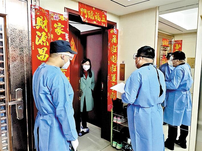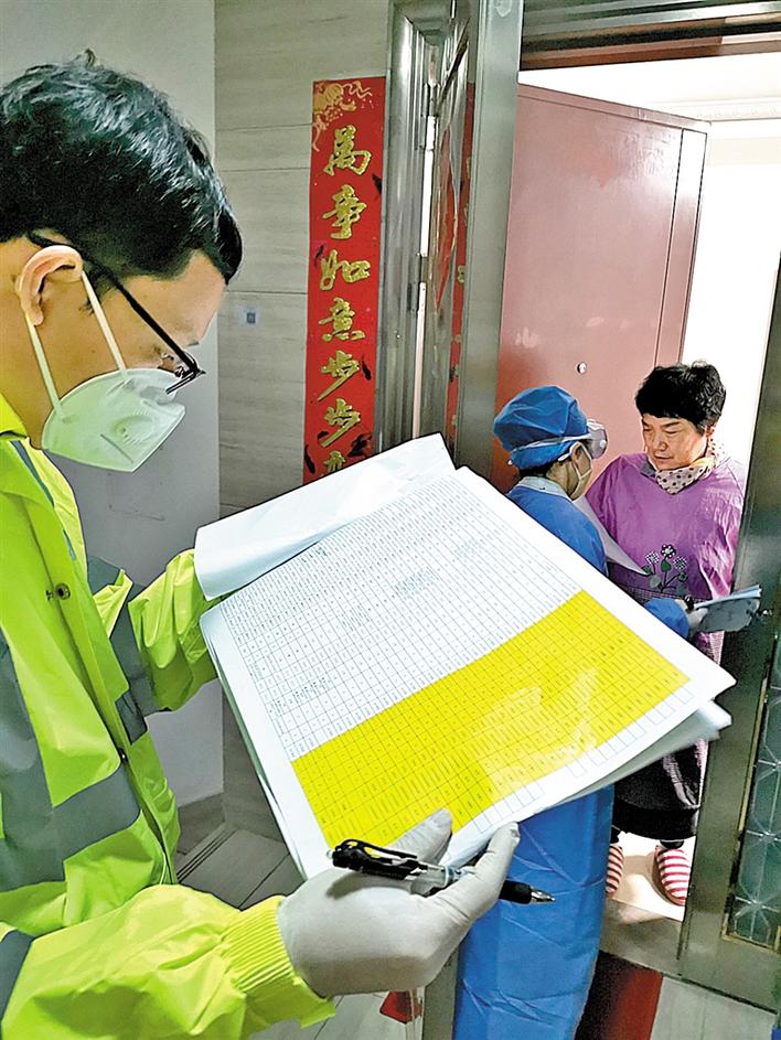 孙犇(右)为居家留观人员服务。