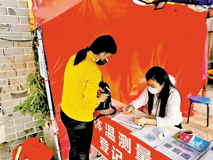 侯瑞(右)在认真核对出入人员信息。